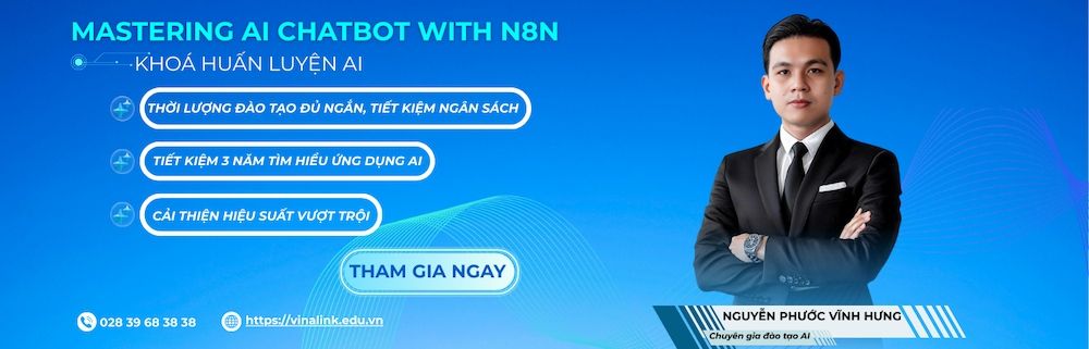 Đừng để rào cản kỹ thuật kìm hãm hiệu suất của bạn. Hãy tham gia ngay khóa học Mastering AI Chatbot & Automation With n8n tại Vinalink Academy. Đây là chương trình đào tạo thực chiến "cầm tay chỉ việc", giúp bạn tự tay xây dựng hệ thống AI Agent & Chatbot thông minh mà không cần biết code.